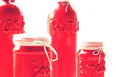 Spray paint the bottles in you’re choice of color. I choose glossy red, but you can also go for a non-glossy color. Make sure that the paint dries completely before handling them, because you can easy get you’re fingerprints on them.